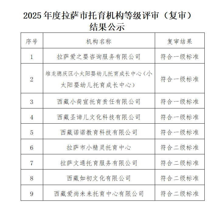 为贯彻落实国家、自治区、拉萨市关于促进3岁以下婴幼儿照护服务发展的有关要求,按照拉萨市卫生健康委关于印发《拉萨市托育机构等级评审工作方案的通知》(拉卫便函〔2025〕41号),经托育机构申请,城关区、堆龙德庆区初审,拉萨市复审,现将2025年拉萨市托育机构等级评审(复审)结果公示如下。