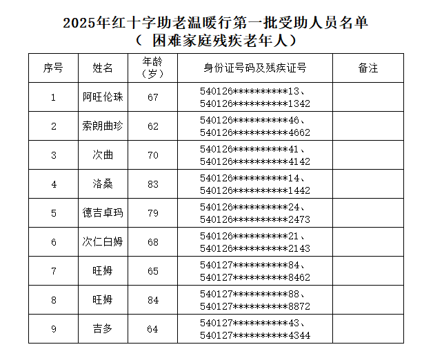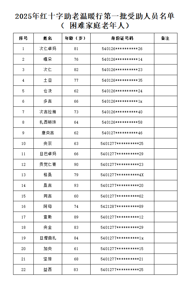 现将第一批受助人员名单公示如下,公示期2025年11月20日-11月26日。如对拟救助对象有异议,请在公示期内用真实姓名通过电话或面谈方式向拉萨市红十字会反映(电话:0891-6323702),联系地址:拉萨市城关区江冲路15号市卫健委4楼409室。如无异议,拉萨市红十字会在公示期满后将按有关规定履行救助程序。