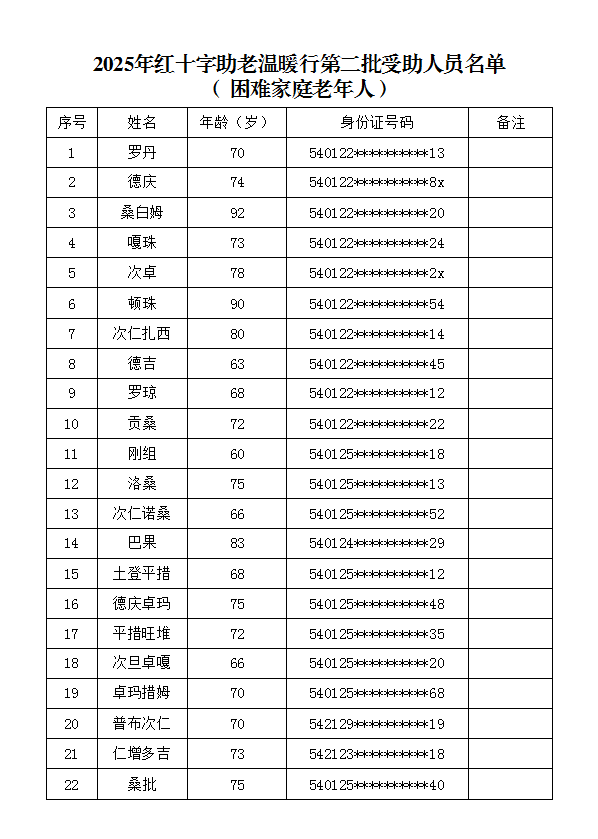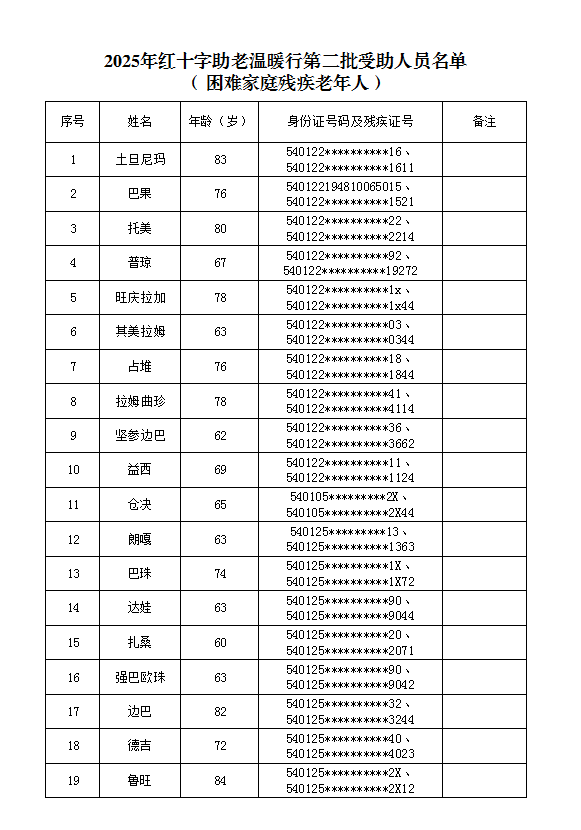 现将第二批受助人员名单公示如下,公示期2025年11月25日-12月1日。如对拟救助对象有异议,请在公示期内用真实姓名通过电话或面谈方式向拉萨市红十字会反映(电话:0891-6323702),联系地址:拉萨市城关区江冲路15号市卫健委4楼409室。如无异议,拉萨市红十字会在公示期满后将按有关规定履行救助程序。